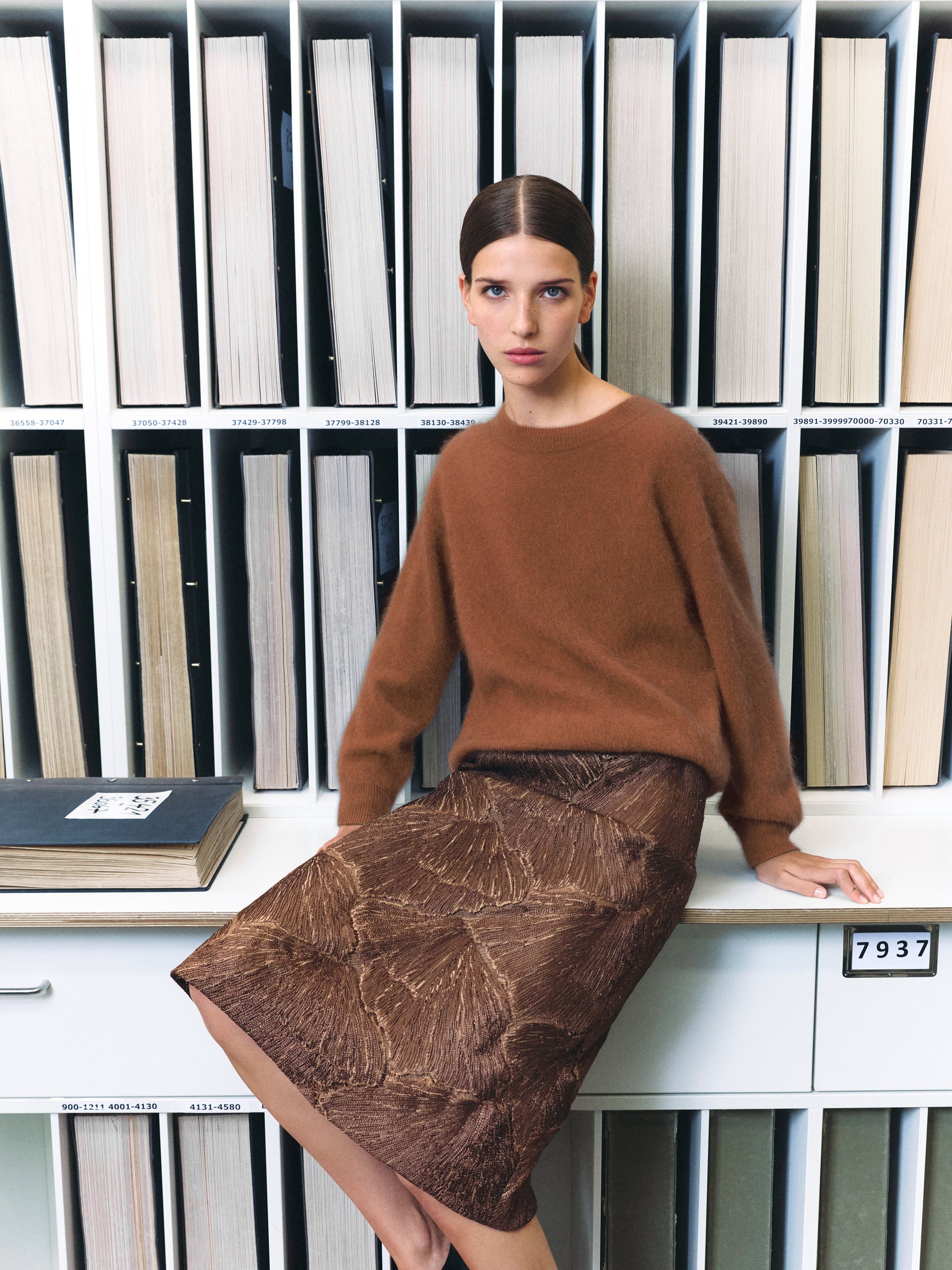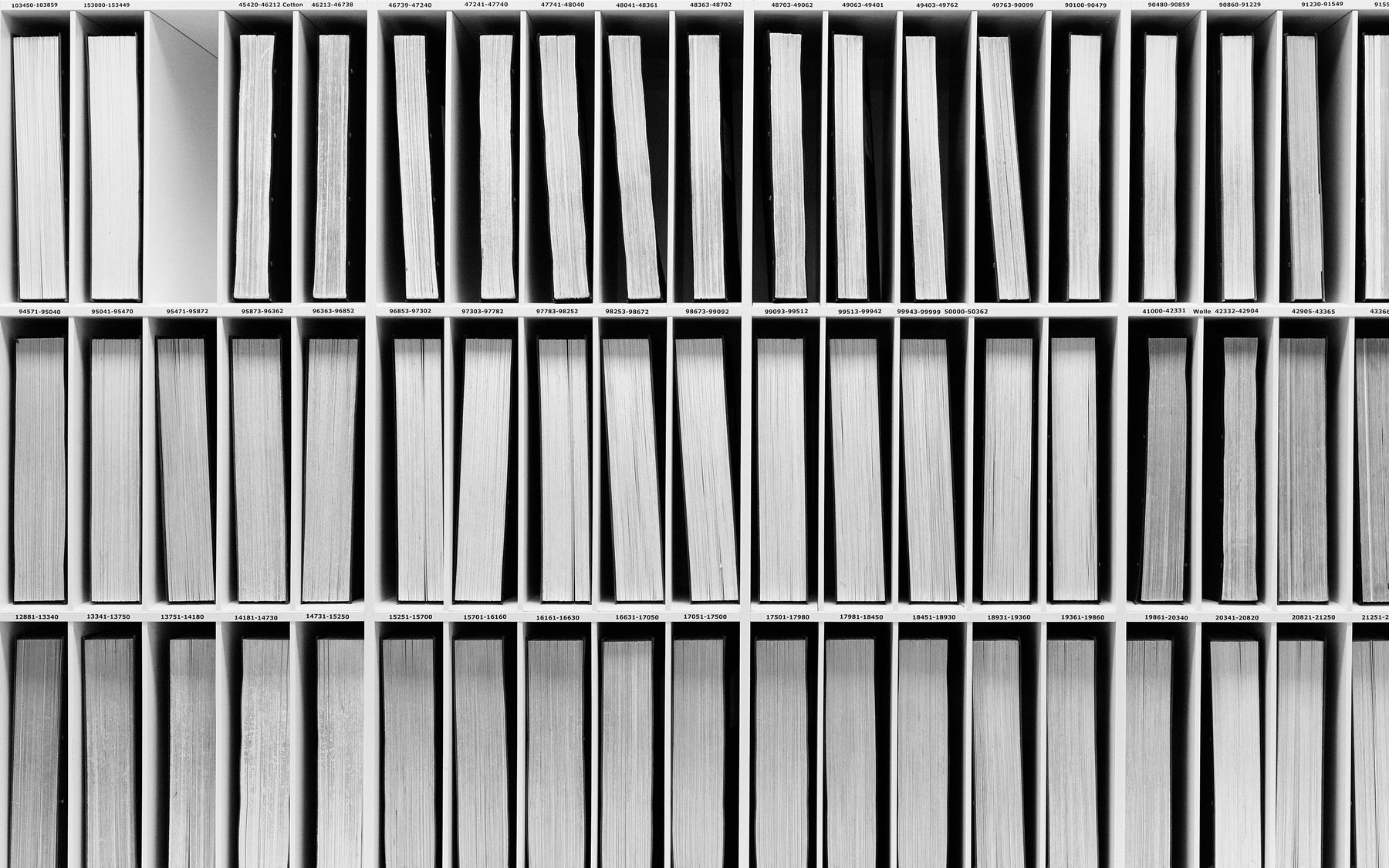 Each book holds hundreds of fabric samples, supplier notes, compositions, and purchase dates — a living archive of Akris’ knowledge. A century of fabrics, bound in books.