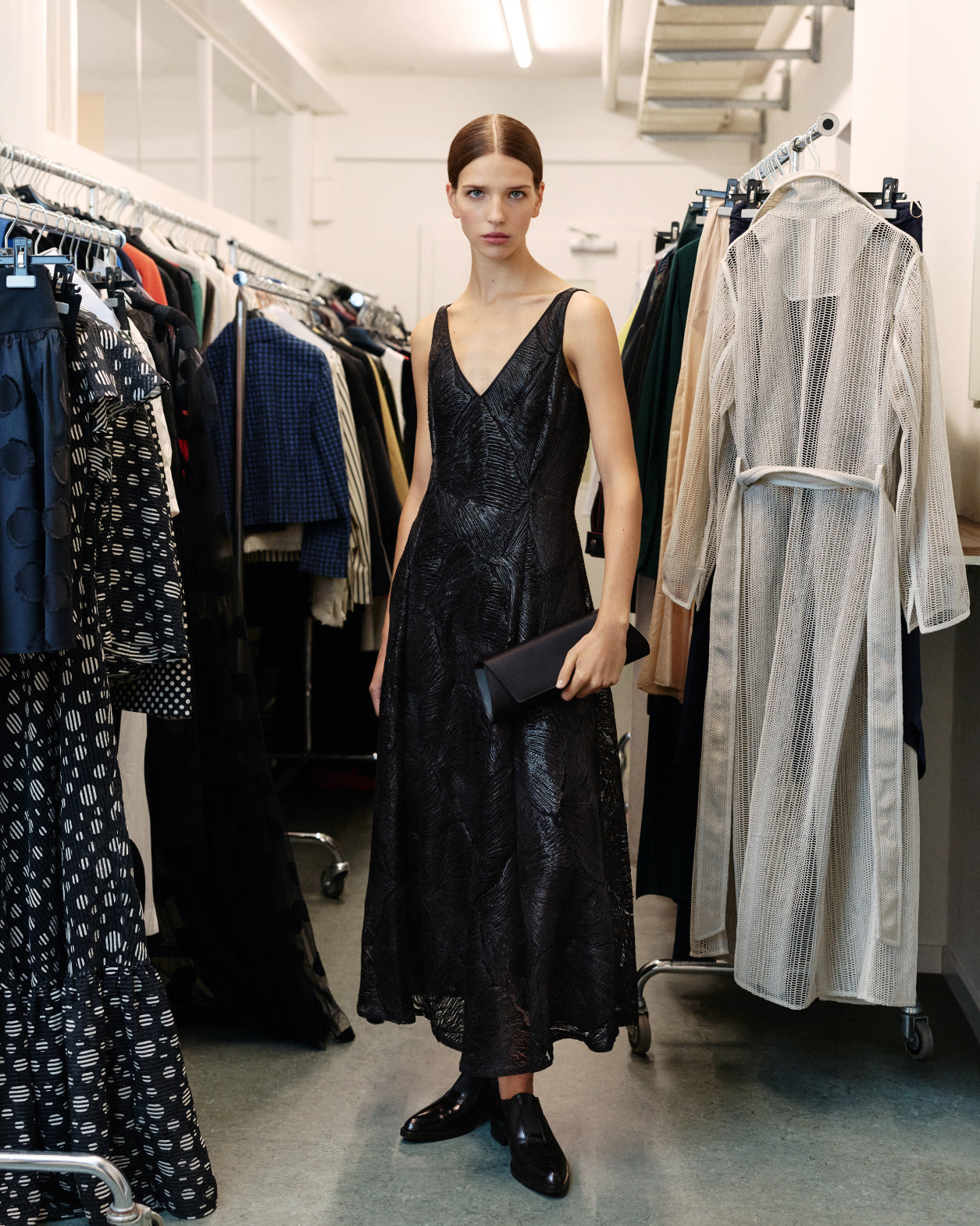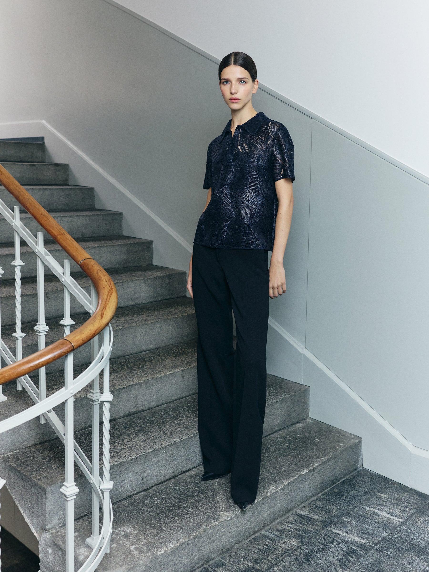 Photographed against the textured backdrop of the Akris ateliers — from the fabric storeroom to the spiral staircases — the collection offers a glimpse inside the heart of Akris, the house where each creation is born.