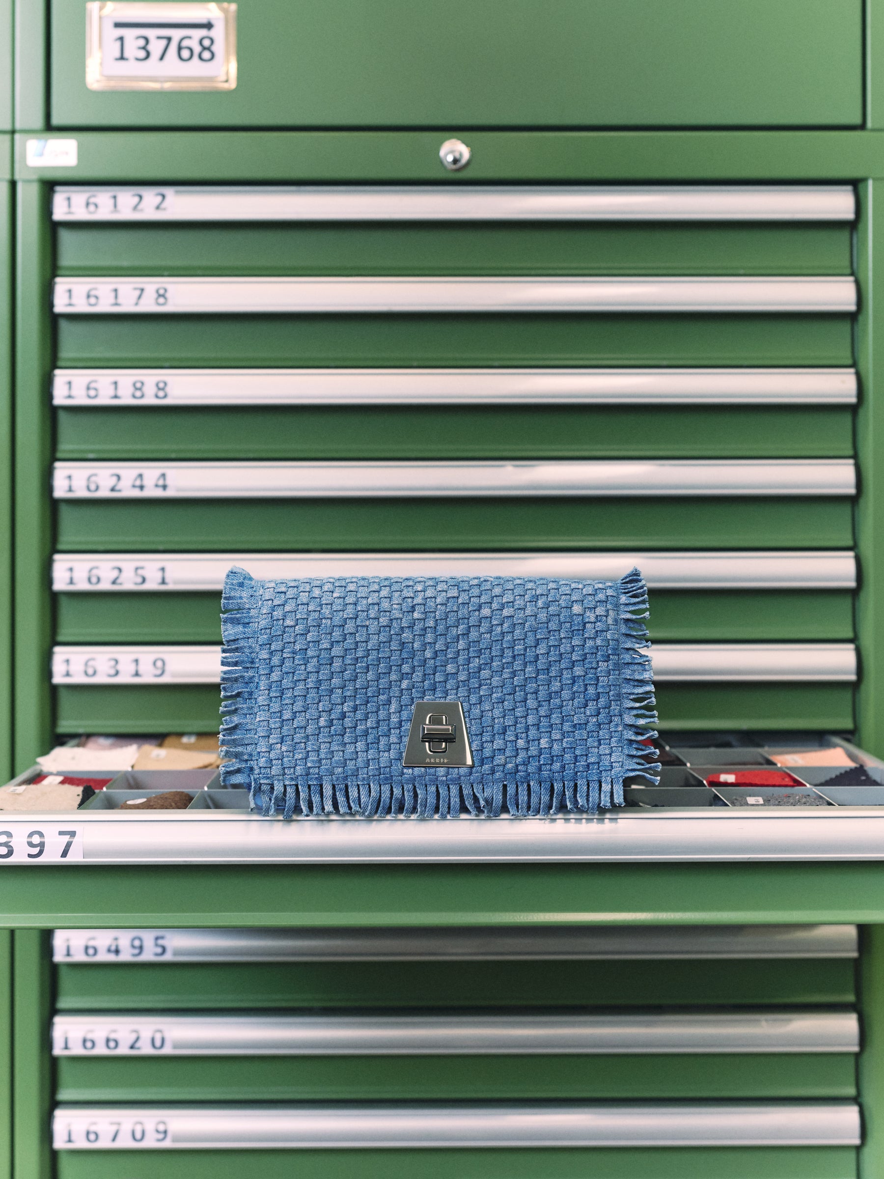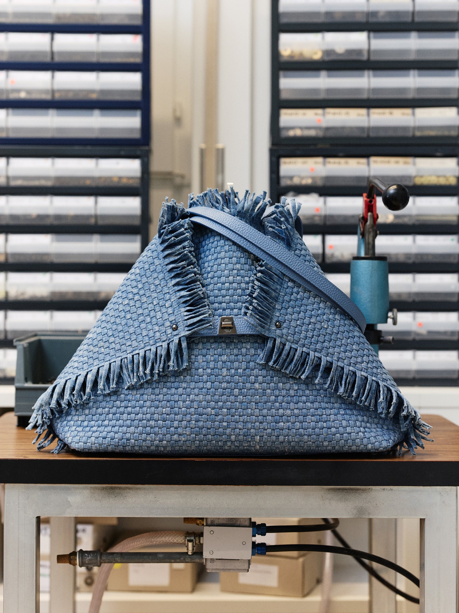 Some of those swatches still rest in these green drawers, now the backdrop for one of his favorite materials: Japanese denim.