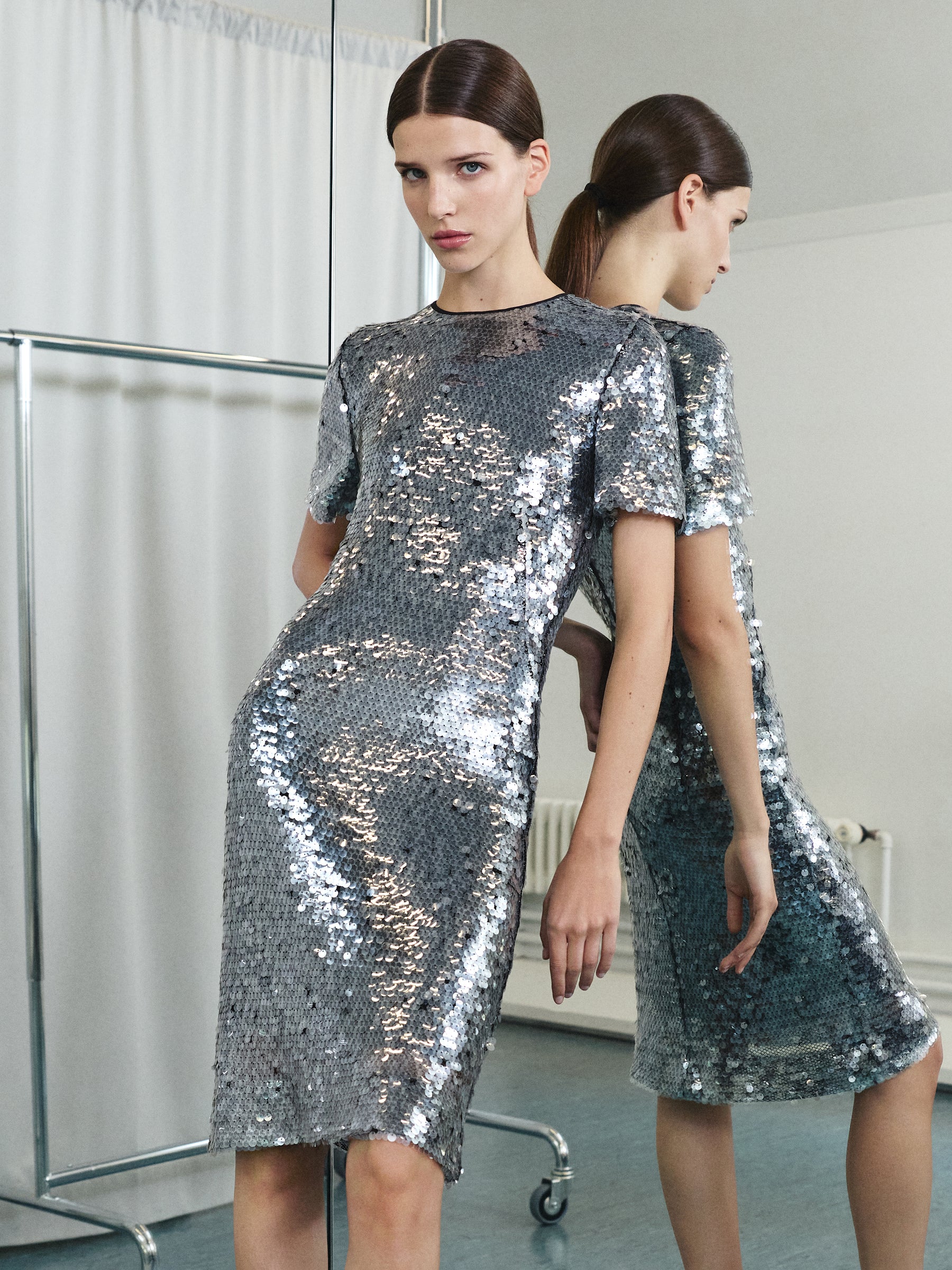 A sheer tulle dusted with sequins, shimmering softly with each movement — an irresistible balance of ease and shine.