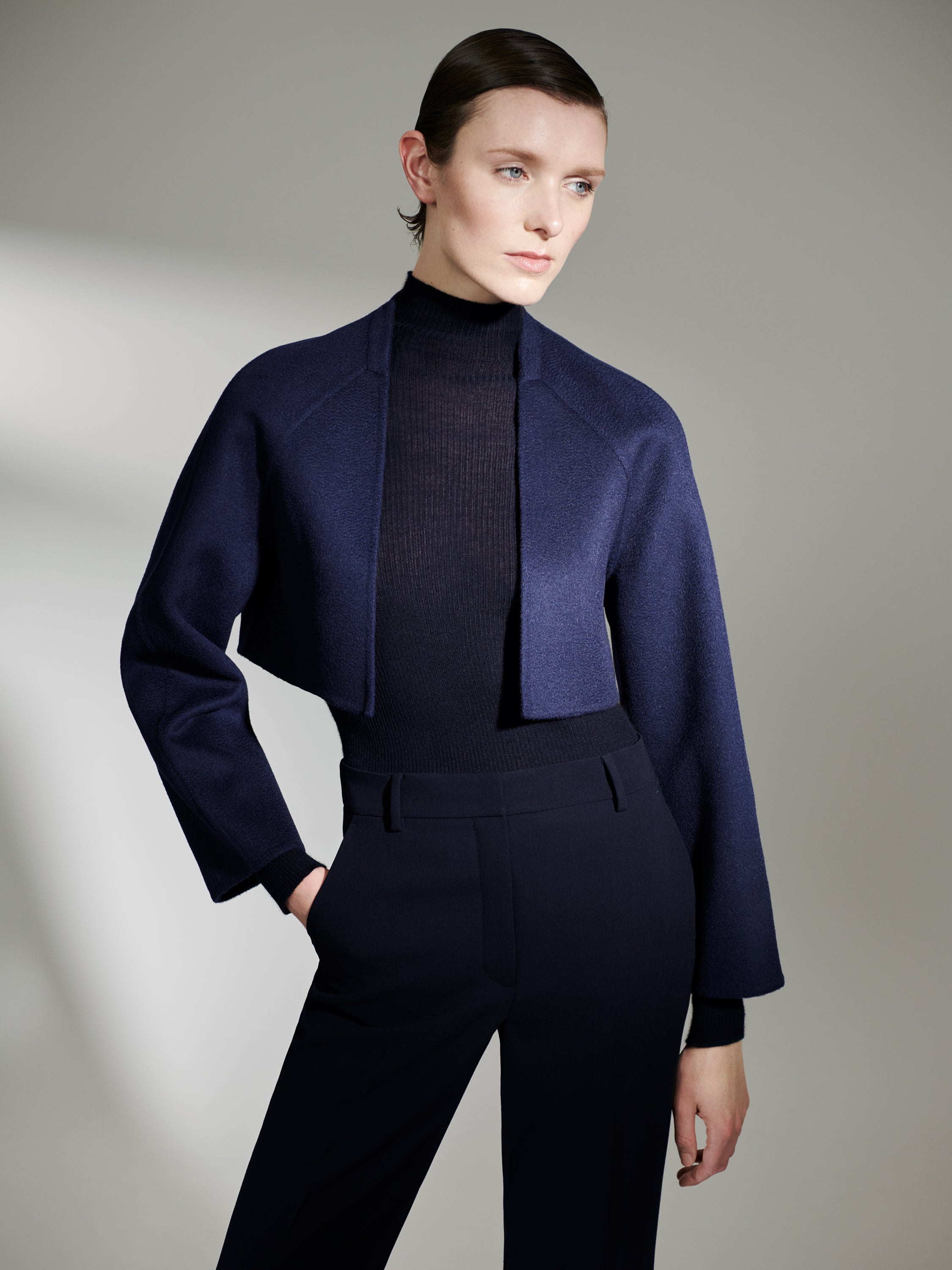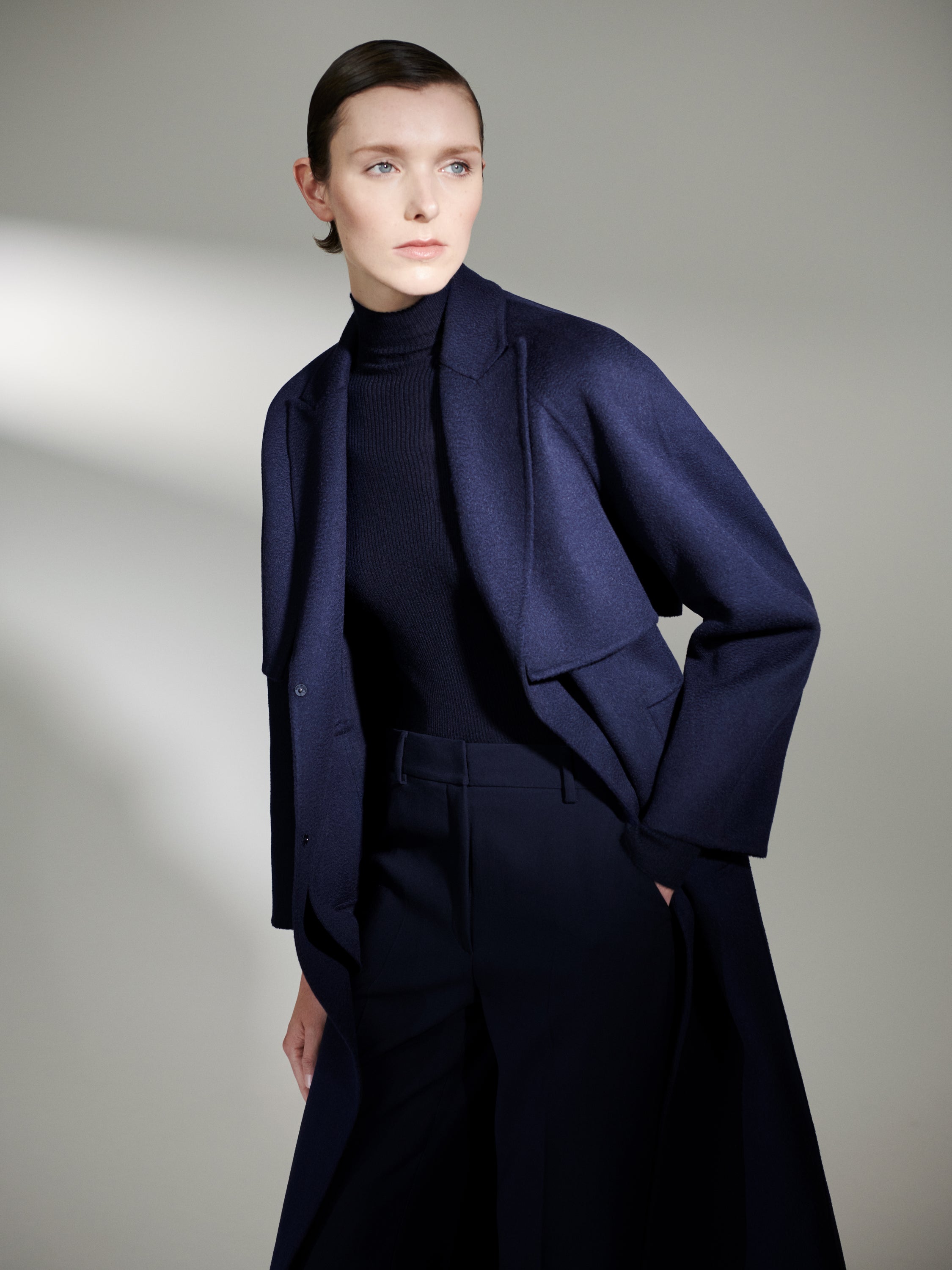 An Akris icon, the Alfa was the fashion house’s first cashmere double-face coat, created by Max Kriemler in 1978. For sourcing the fabric, Albert’s father took him to an Italian mill that made cashmere. One meter of that cashmere weights 800 grams and cost 250 francs. This Italian mill is still one of Akris’ cashmere suppliers. Creative Director Albert Kriemler revived the design in 2023 as an homage to his father and in celebration of Akris’ 100 year anniversary.