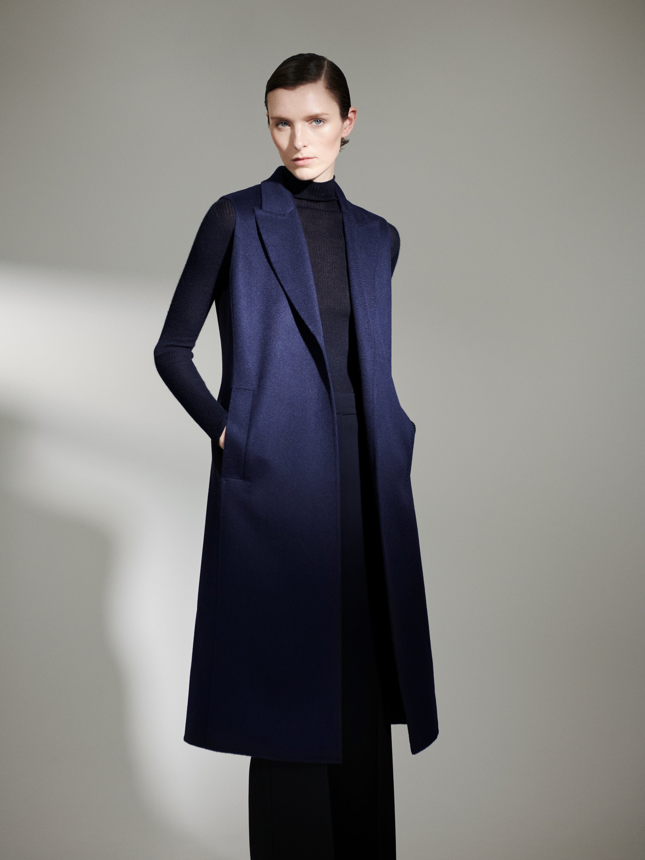 Two coming together as one! The Duo Coat is Akris newest answer to a women’s multitude of realities. A versatile duet of a long gilet and cropped jacket that easily can be transformed into separates. Drawing from this season’s idea of layering and Akris core values of smart design, the wool double-face coat is also a nod to unpredictable weather changes and can be worn in 3 different ways.