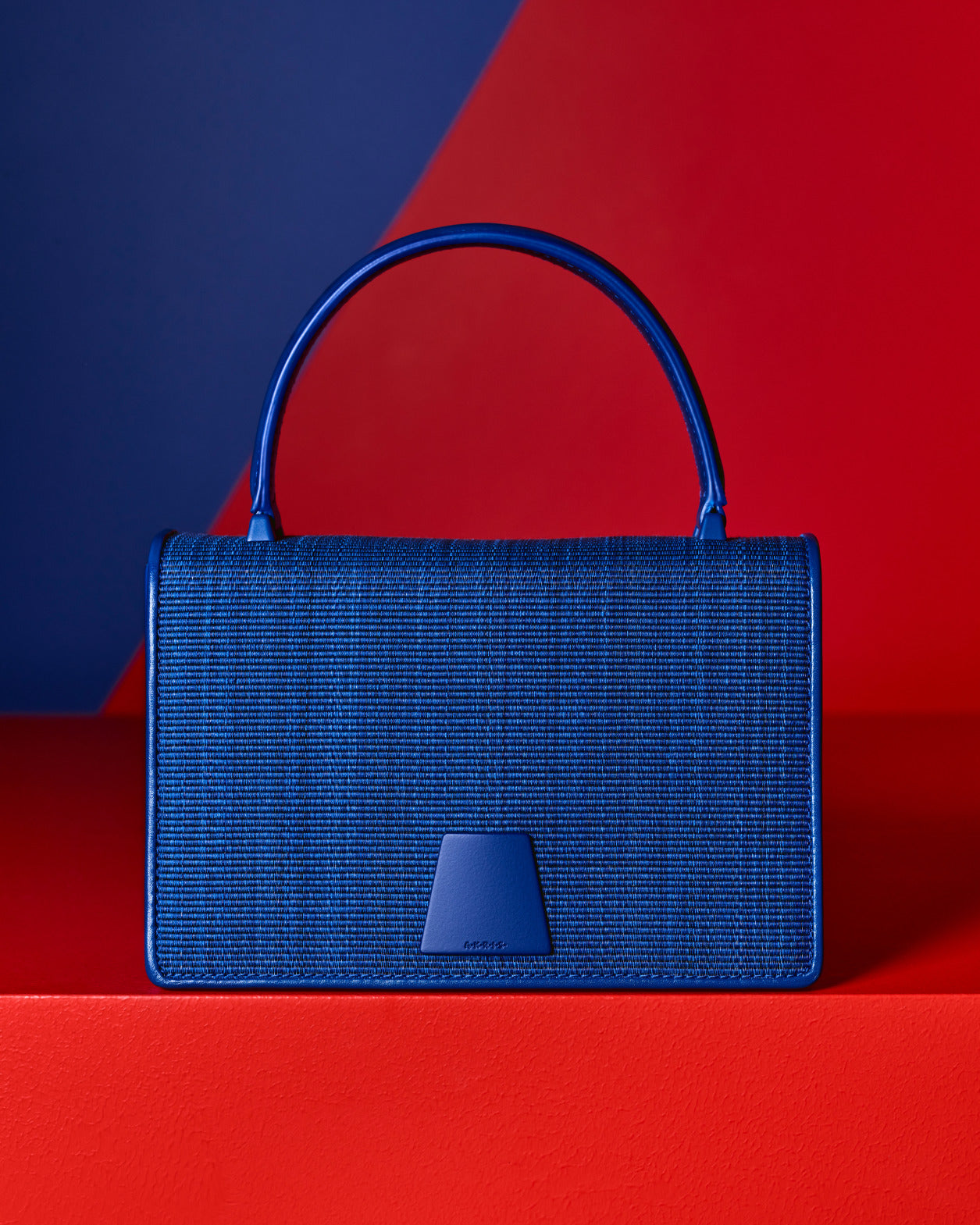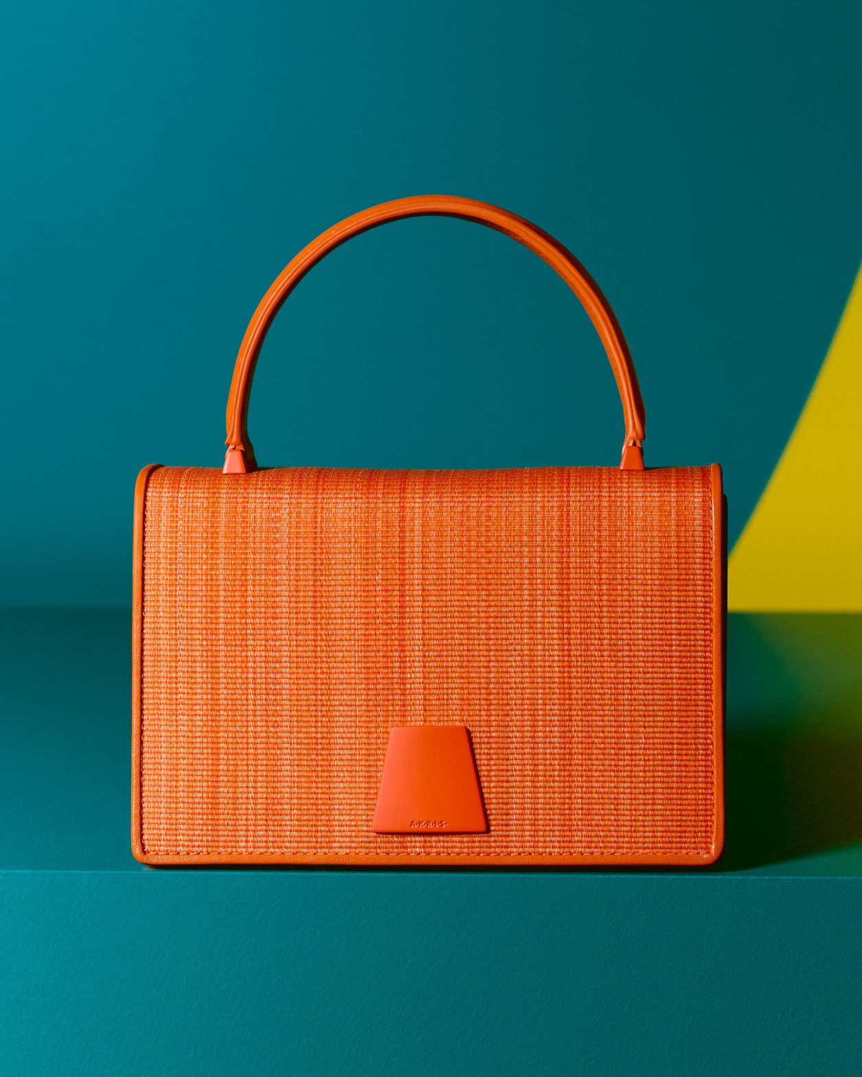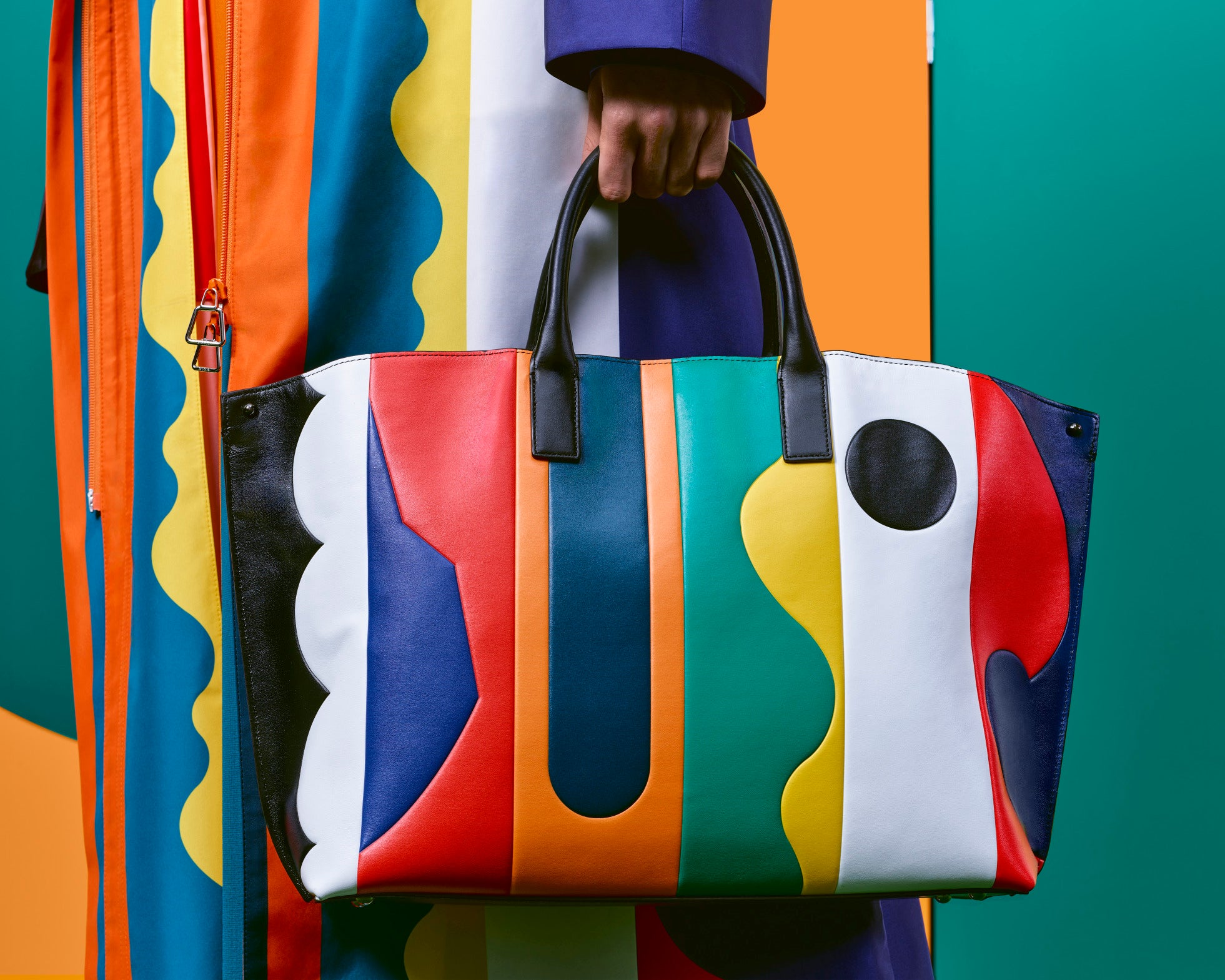 The Alice bag in horsehair is charged with sudden rushes of sun, lapis blue, and orange. A flash in Leon Polk Smith color.
