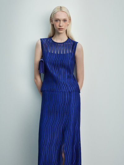 Sensuality and intuition beneath Smith’s minimalism unfold in drape fringe knit — an in-house development echoing his curvilinear line, shaping the body with ease and intent. Trapezoid embroidery, Akris’ distinctive shape, appears in dress and gown — not as ornament, but as presence in couture-like construction.