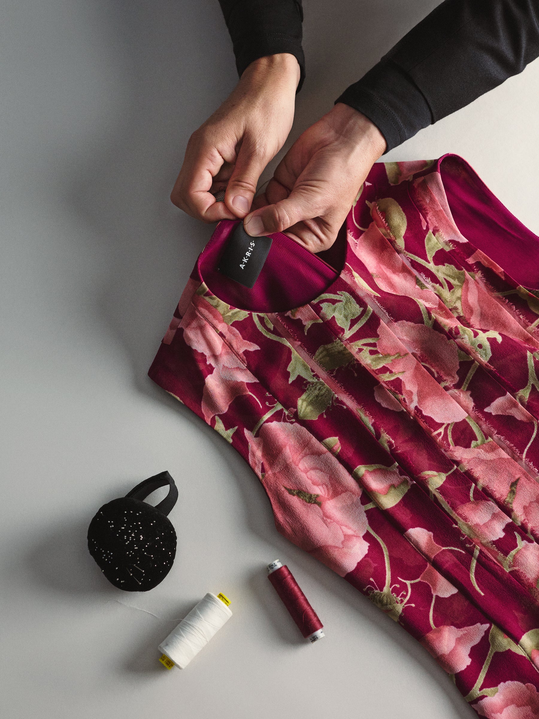 Inspired by the lightness of the waltz Roses from the South and the precise rhythm of the Diplomat Polka by Johann Strauss (son), Kriemler created pure, flowing silk georgette dresses and suits in velvet and wool double-face: garments that make movement, expression, and dance itself visible.